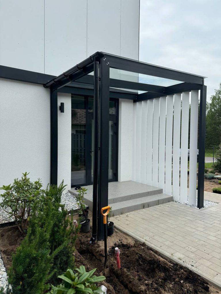 Конструкция навеса отличается не только впечатляющим внешним видом, но и высокой прочностью и долговечностью. Алюминиевый каркас обеспечивает надежную основу, а закаленное стекло устойчиво к механическим воздействиям и перепадам температур. Благодаря этому навес сохранит свой привлекательный вид на долгие годы.